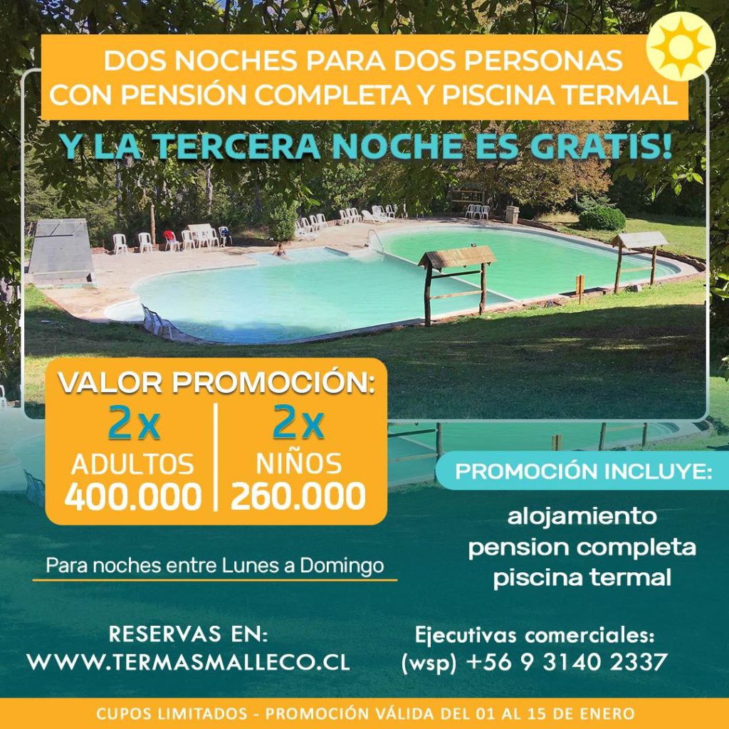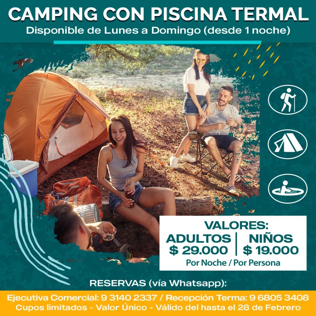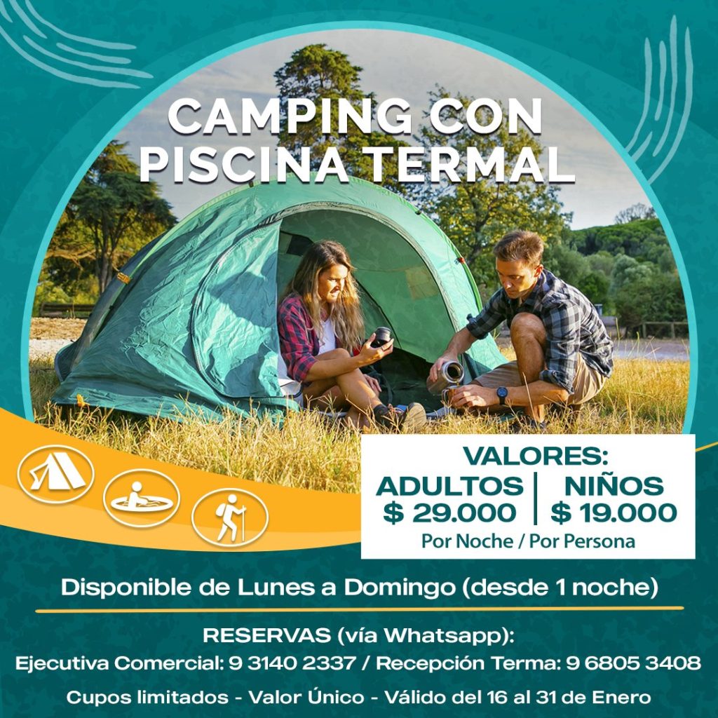 CAMPING VERANO 2026 Disfruta tus vacaciones en las termas! Camping - Enero (del 16 al 31) Camping con Piscina Termal – Enero (del 16 al 31) Reservar ahora Promoción Alojamiento con Tercera Noche Gratis – Enero (del 01 al 15) Reservar ahora Alojamiento con Piscina Termal sin Pensión – Enero (del 01 al 15) Reservar ahora Camping - Febrero Camping con Piscina Termal – Febrero Reservar ahora Promoción Alojamiento con Tercera Noche Gratis – Enero (del 01 al 15) Reservar ahora Alojamiento con Piscina Termal sin Pensión – Enero (del 01 al 15) Reservar ahora