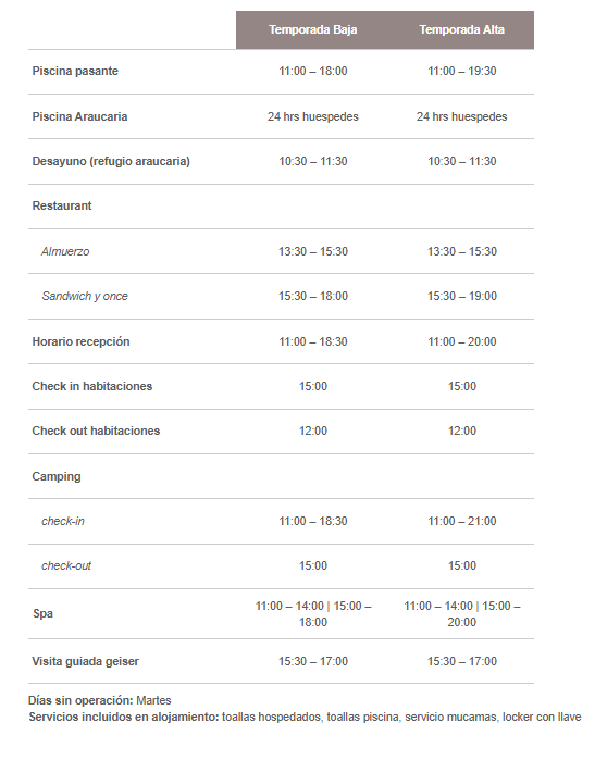 | Desayuno (refugio araucaria) | 10:30 – 11:30 | 10:30 – 11:30 |